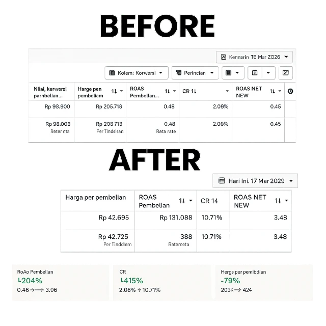 Dengan CTR yang lebih tinggi, biaya iklan lebih efisien, dan konversi yang lebih baik, budget iklan yang sama dapat menghasilkan omzet lebih besar dibanding sebelumnya.